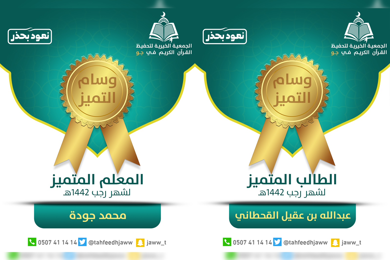 حصل الطالب عبدالله بن عقيل القحطاني على جائزة التميز لشهر رجب لعام ١٤٤٢هـ ،فيما حصل المعلم محمد جودة على معلم التميز للشهر نفسه وأثنت الشؤون